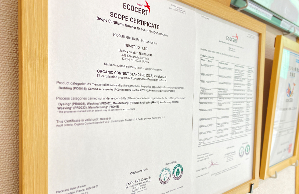 原料だけでなく、加工・縫製・保管・表示に至るまで、第三者機関によるチェックを毎年受け続けています。