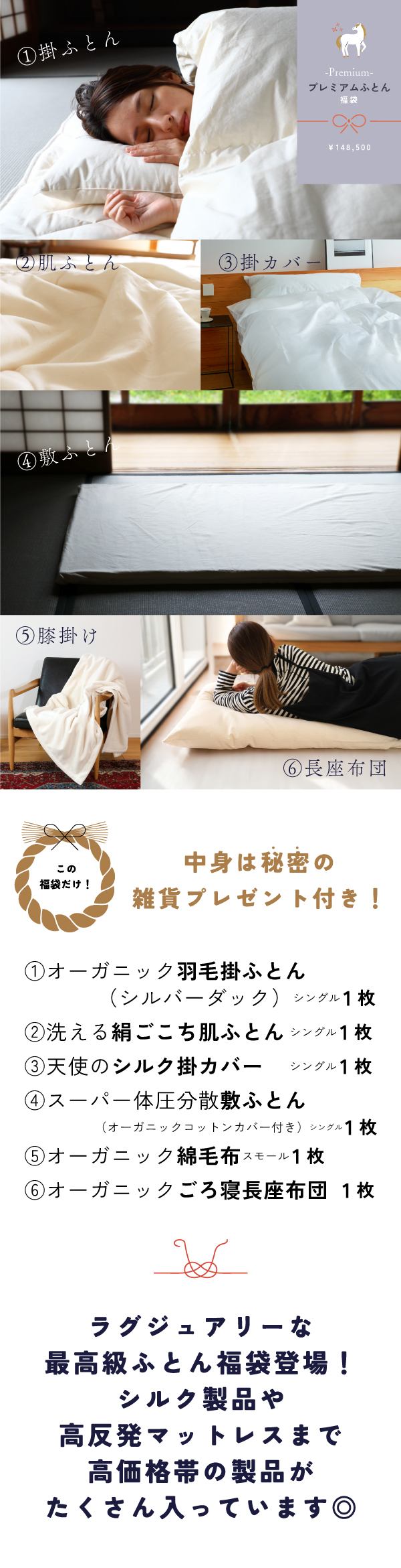 羽毛ふとんにマットレスにシルクカバー…などなど、高価格帯のアイテムがたっぷり入った、最もラグジュアリーな福袋がこちら♪